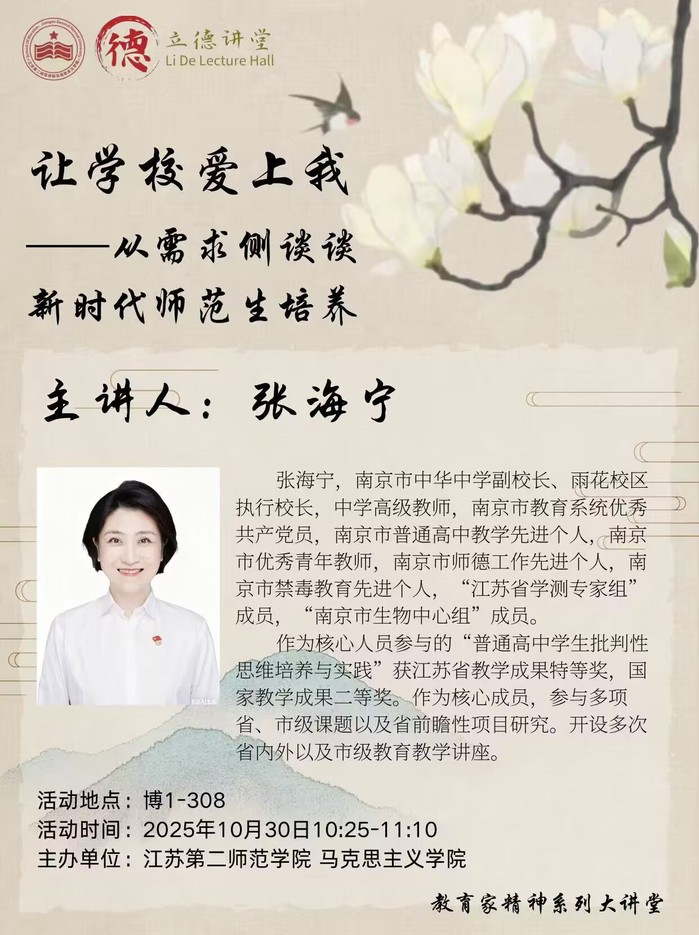 10月30日上午,马克思主义学院邀请南京市中华中学副校长、雨花校区执行校长,中学高级教师,南京市教育系统优秀共产党员,南京市普通高中教学先进个人,南京市优秀青年教师,南京市师德工作先进个人,南京市禁毒教育先进个人,“江苏省学测专家组”成员,“南京市生物中心组”成员张海宁老师来到江苏第二师范学院,面向我校24级俄语普本班学子们,开展“让学校爱上我——从需求侧谈谈新时代师范生培养”讲座。