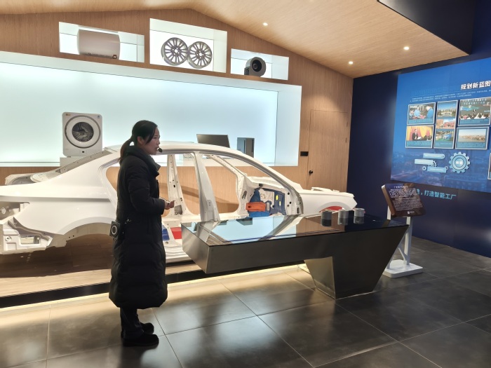 二楼展厅,汽车车身模型、零部件展示揭示了钢铁工业与现代生活的紧密联系,“规划新蓝图”展板则勾勒出钢铁工业与现代科技、绿色理念深度融合的可持续发展路径,互动展示台让同学们亲手触摸到钢铁工业精密、智慧的未来图景。