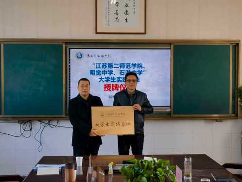 活动现场,江苏第二师范学院教务处处长仇方道为南京市溧水区石湫中学、南京市溧水区明觉初级中学授予大学生实践基地铜牌。